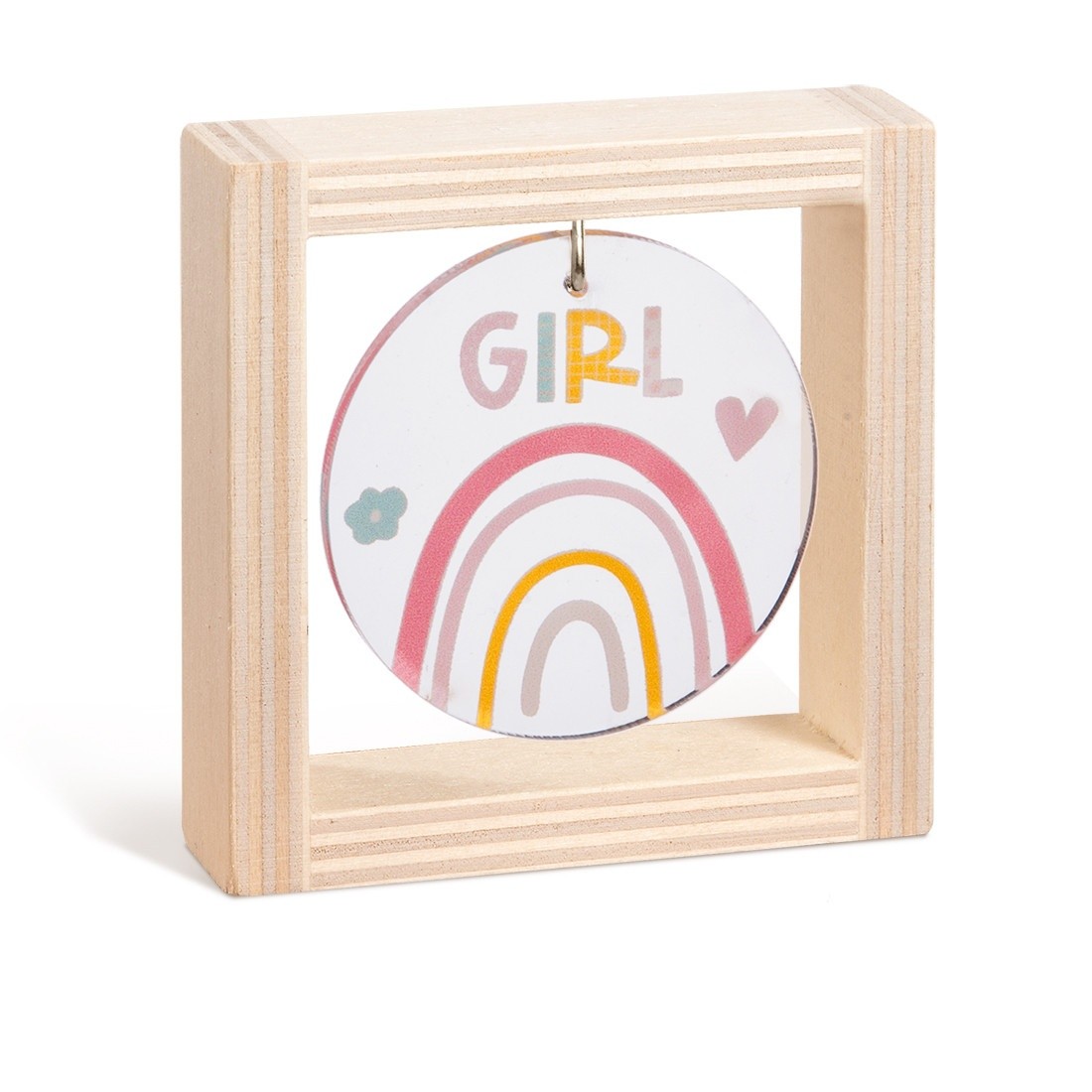 Ξύλινο τετράγωνο καδράκι με στρογγυλή print παράσταση από plexiglass σε διάφανο χρώμα. Η παράσταση απεικονίζει το ουράνιο τόξο σε ροζ girlish αποχρώσεις.