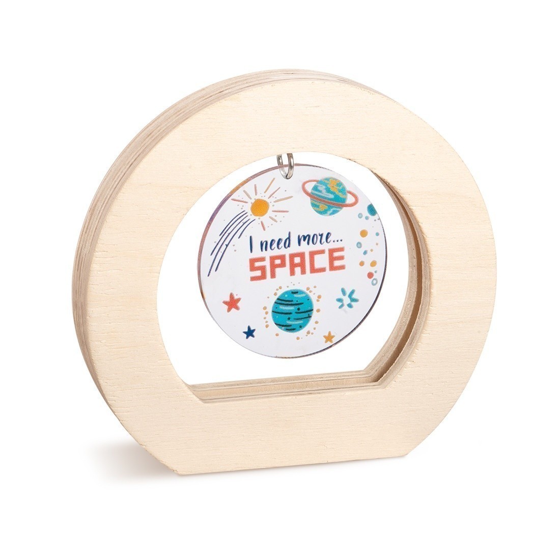 Ξύλινο οβάλ καδράκι σε natural χρώμα. Το εσωτερικό είναι διακοσμημένο με κρεμαστή plexiglass print παράσταση σε στρογγυλό σχήμα με θέμα το διάστημα και μότο "I need more space" .