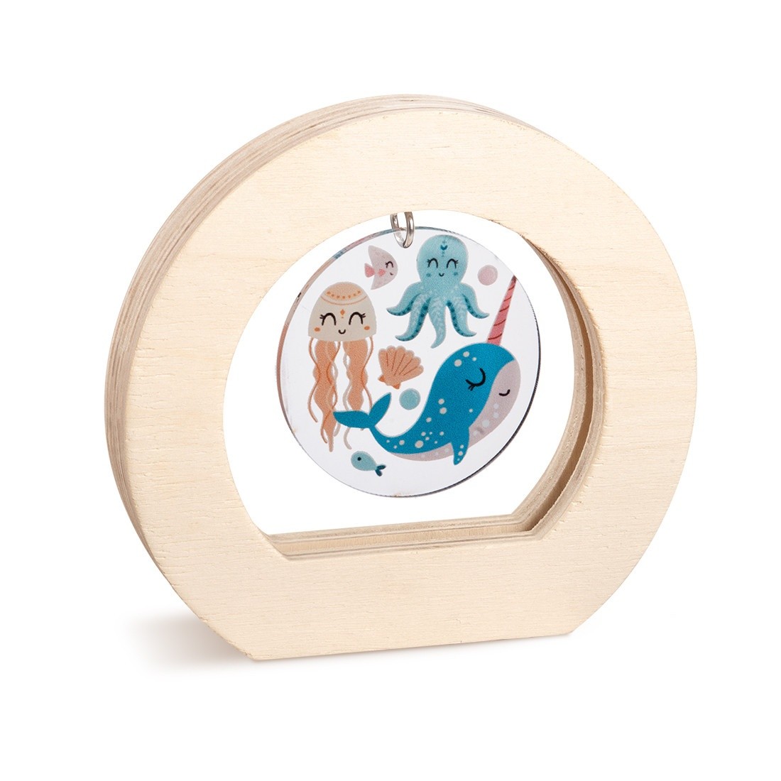 Ξύλινο οβάλ καδράκι σε natural χρώμα. Το εσωτερικό είναι διακοσμημένο με κρεμαστή plexiglass print παράσταση σε στρογγυλό σχήμα με θέμα το βυθό της θάλασσας και τα ζωάκια φάλαινα, μέδουσα και χταπόδι .