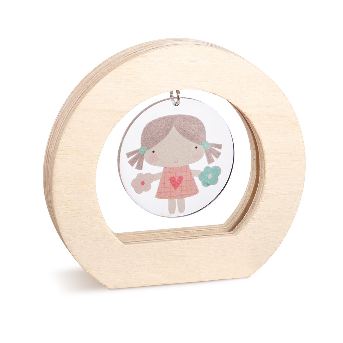 Ξύλινο οβάλ καδράκι σε natural χρώμα. Το εσωτερικό είναι διακοσμημένο με κρεμαστή plexiglass print παράσταση σε στρογγυλό σχήμα με θέμα ένα κοριτσάκι σε ροζ girlish χρωματισμούς .