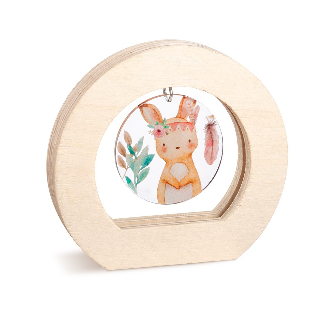 Ξύλινο οβάλ καδράκι σε natural χρώμα. Το εσωτερικό είναι διακοσμημένο με κρεμαστή plexiglass print παράσταση σε στρογγυλό σχήμα με θέμα λαγουδάκι σε boho style .