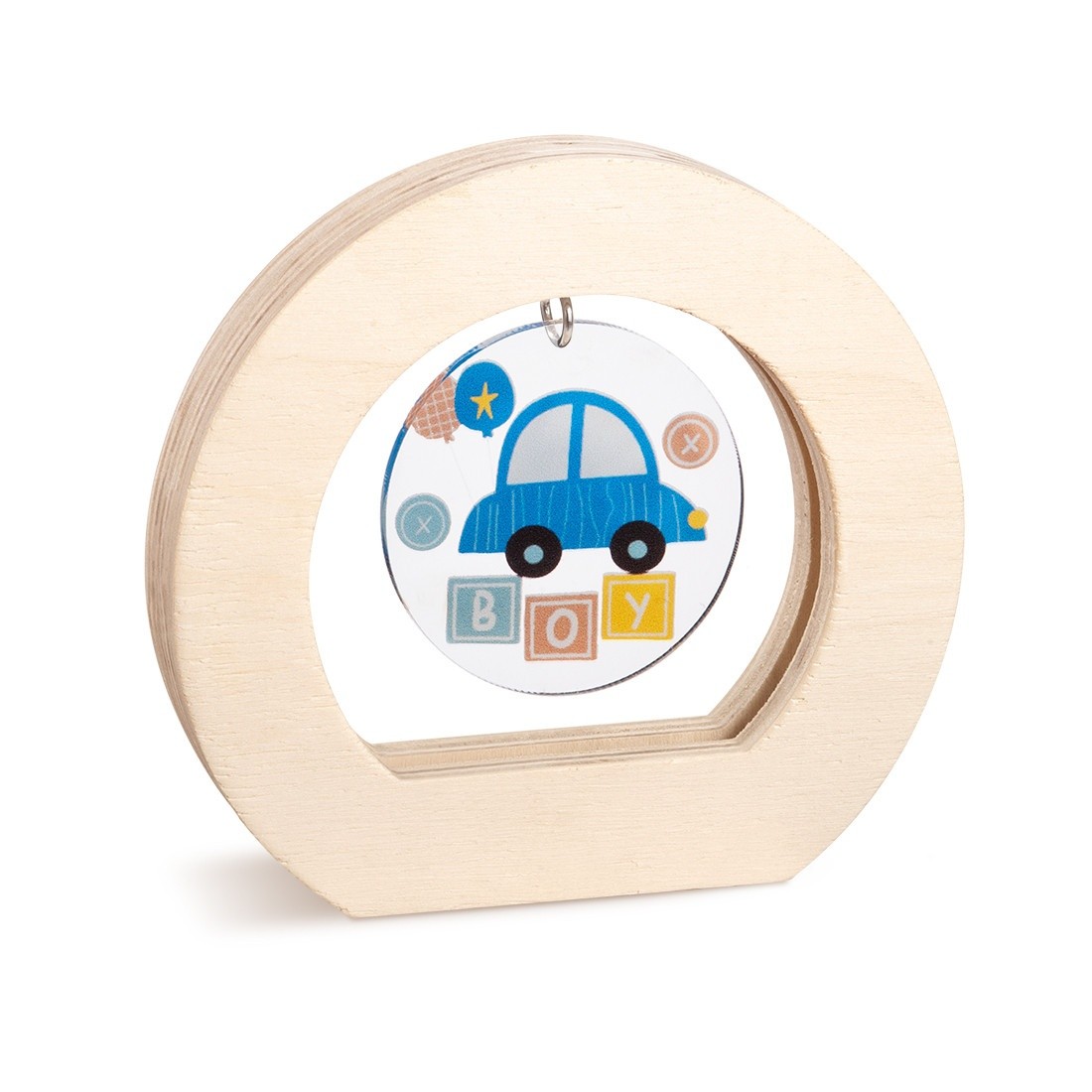 Ξύλινο οβάλ καδράκι σε natural χρώμα. Το εσωτερικό είναι διακοσμημένο με κρεμαστή plexiglass print παράσταση σε στρογγυλό σχήμα με θέμα σιέλ παιδικό αυτοκινητάκι .