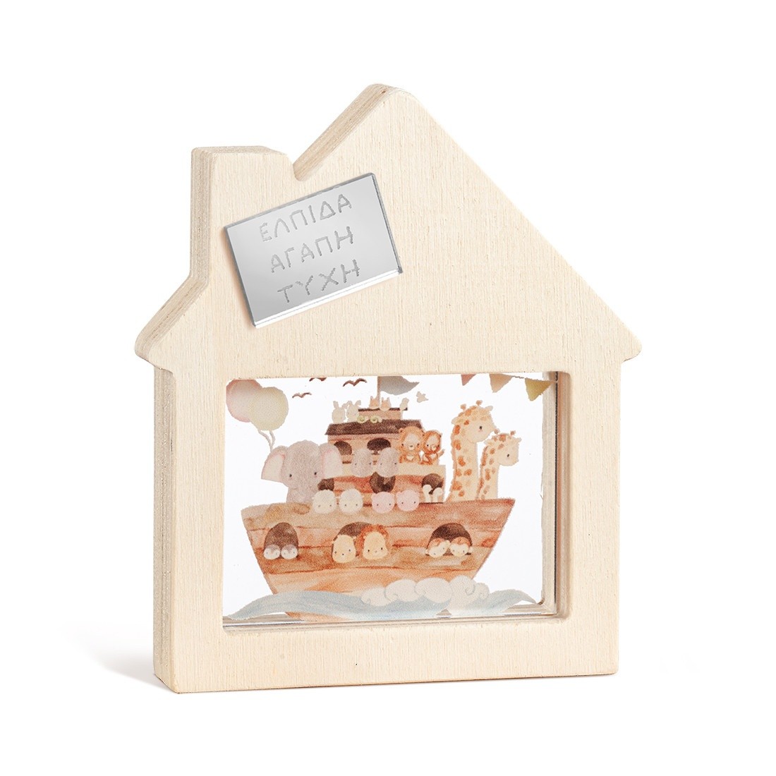 Ξύλινο διακοσμητικό σπιτάκι με καμινάδα και εσοχή σε παραλληλόγραμμο σχήμα. Στο κέντρο είναι διακοσμημένο με παραλληλόγραμμο print plexiglass σε διάφανο χρώμα. Η παράσταση απεικονίζει την κιβωτό με τα ζωάκια .