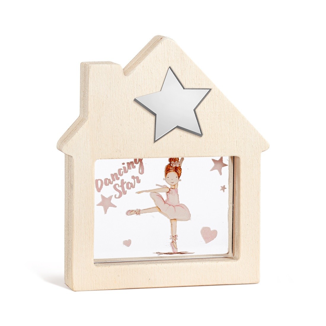 Ξύλινο διακοσμητικό σπιτάκι με καμινάδα και εσοχή σε παραλληλόγραμμο σχήμα. Στο κέντρο είναι διακοσμημένο με παραλληλόγραμμο print plexiglass σε διάφανο χρώμα. Η παράσταση απεικονίζει την μπαλαρίνα-dancing star .