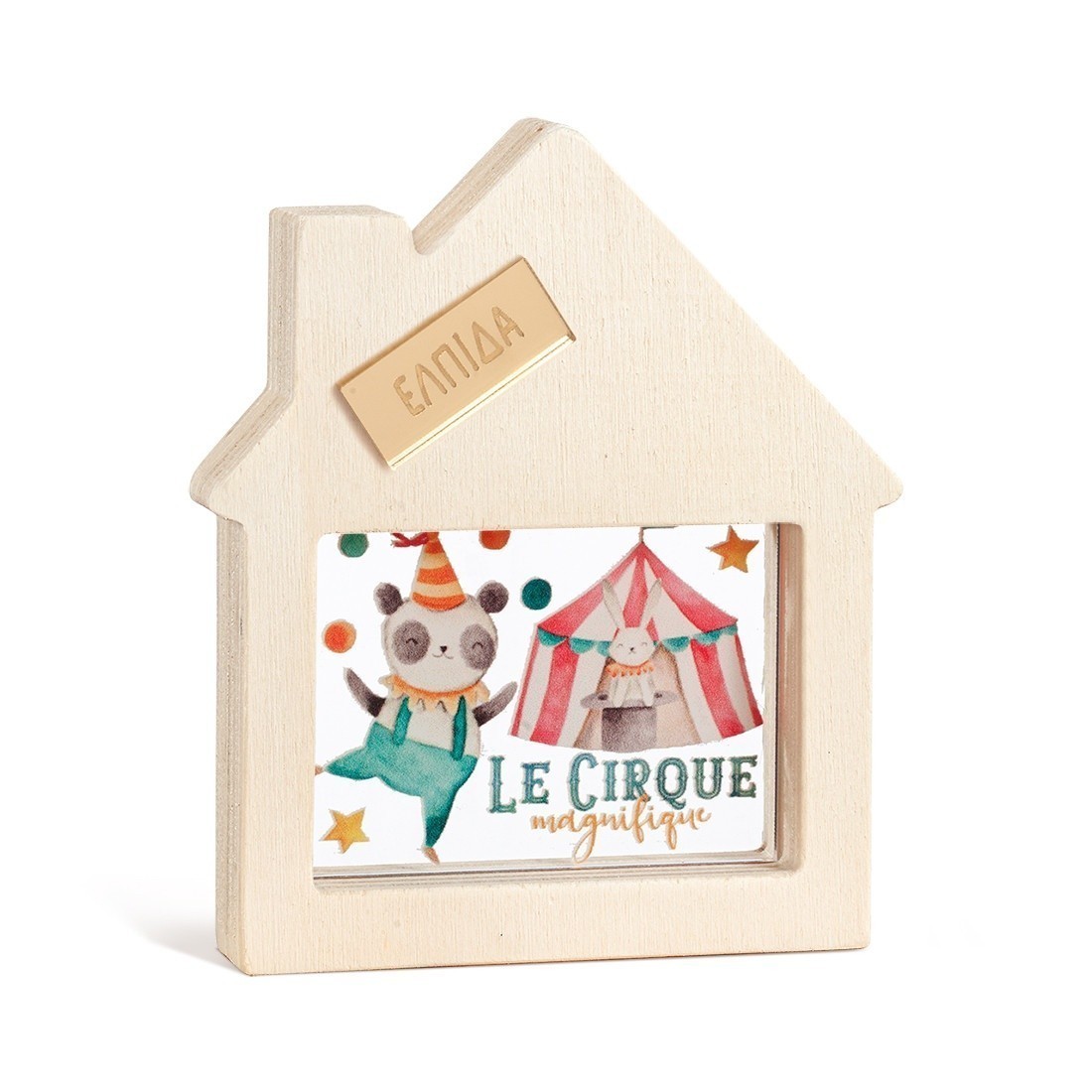 Ξύλινο διακοσμητικό σπιτάκι με καμινάδα και εσοχή σε παραλληλόγραμμο σχήμα. Στο κέντρο είναι διακοσμημένο με παραλληλόγραμμο print plexiglass σε διάφανο χρώμα. Η παράσταση απεικονίζει to panda-ακροβάτη με φόντο την σκηνή του τσίρκου.
