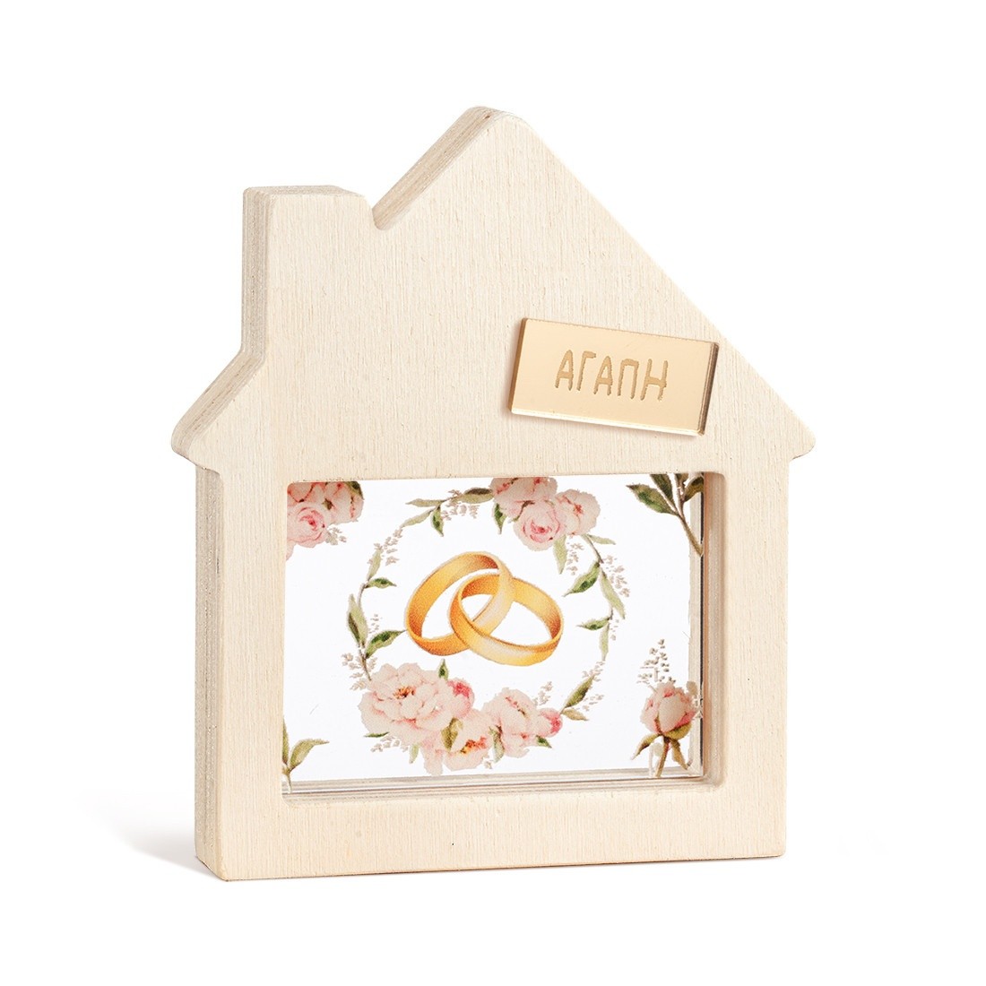 Ξύλινο διακοσμητικό σπιτάκι με καμινάδα και εσοχή σε παραλληλόγραμμο σχήμα. Στο κέντρο είναι διακοσμημένο με παραλληλόγραμμο print plexiglass σε διάφανο χρώμα. Η παράσταση απεικονίζει χρυσές βέρες μέσα σε ένα στεφανάκι από ροζ παιώνια .