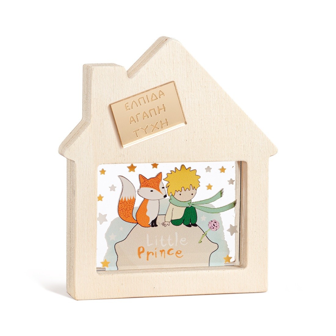 Ξύλινο διακοσμητικό σπιτάκι με καμινάδα και εσοχή σε παραλληλόγραμμο σχήμα. Στο κέντρο είναι διακοσμημένο με παραλληλόγραμμο print plexiglass σε διάφανο χρώμα. Η παράσταση απεικονίζει την κλασσική φιγούρα του μικρού πρίγκηπα.