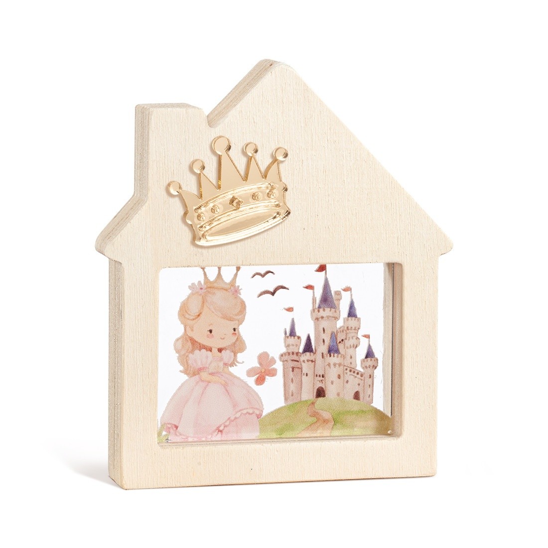 Ξύλινο διακοσμητικό σπιτάκι με καμινάδα και εσοχή σε παραλληλόγραμμο σχήμα. Στο κέντρο είναι διακοσμημένο με παραλληλόγραμμο print plexiglass σε διάφανο χρώμα. Η παράσταση απεικονίζει την πριγκίπισσα του παραμυθιού με φόντο το κάστρο .