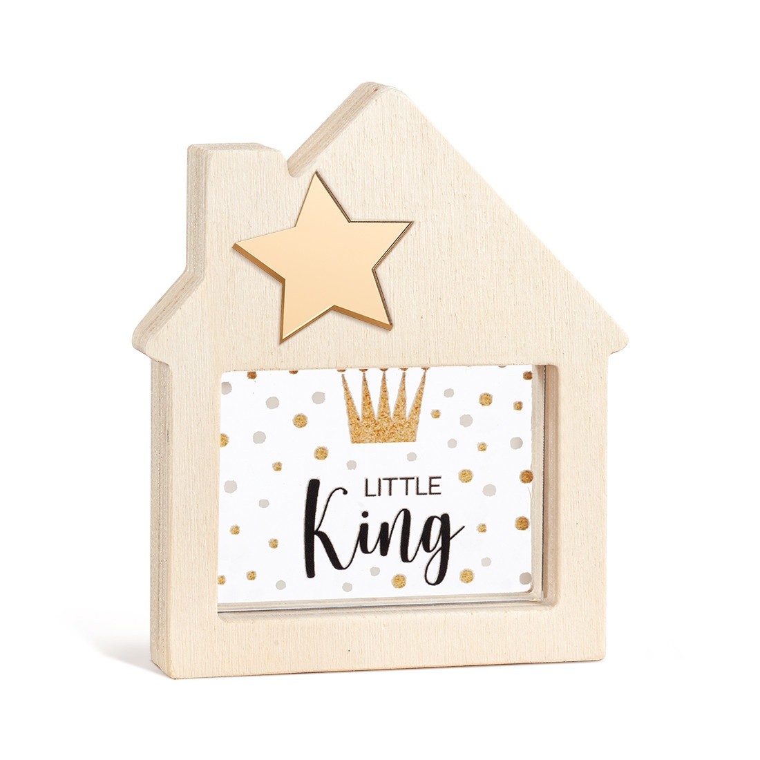 Ξύλινο διακοσμητικό σπιτάκι με καμινάδα και εσοχή σε παραλληλόγραμμο σχήμα. Στο κέντρο είναι διακοσμημένο με παραλληλόγραμμο print plexiglass σε διάφανο χρώμα. Η παράσταση απεικονίζει το στέμμα του Little king .