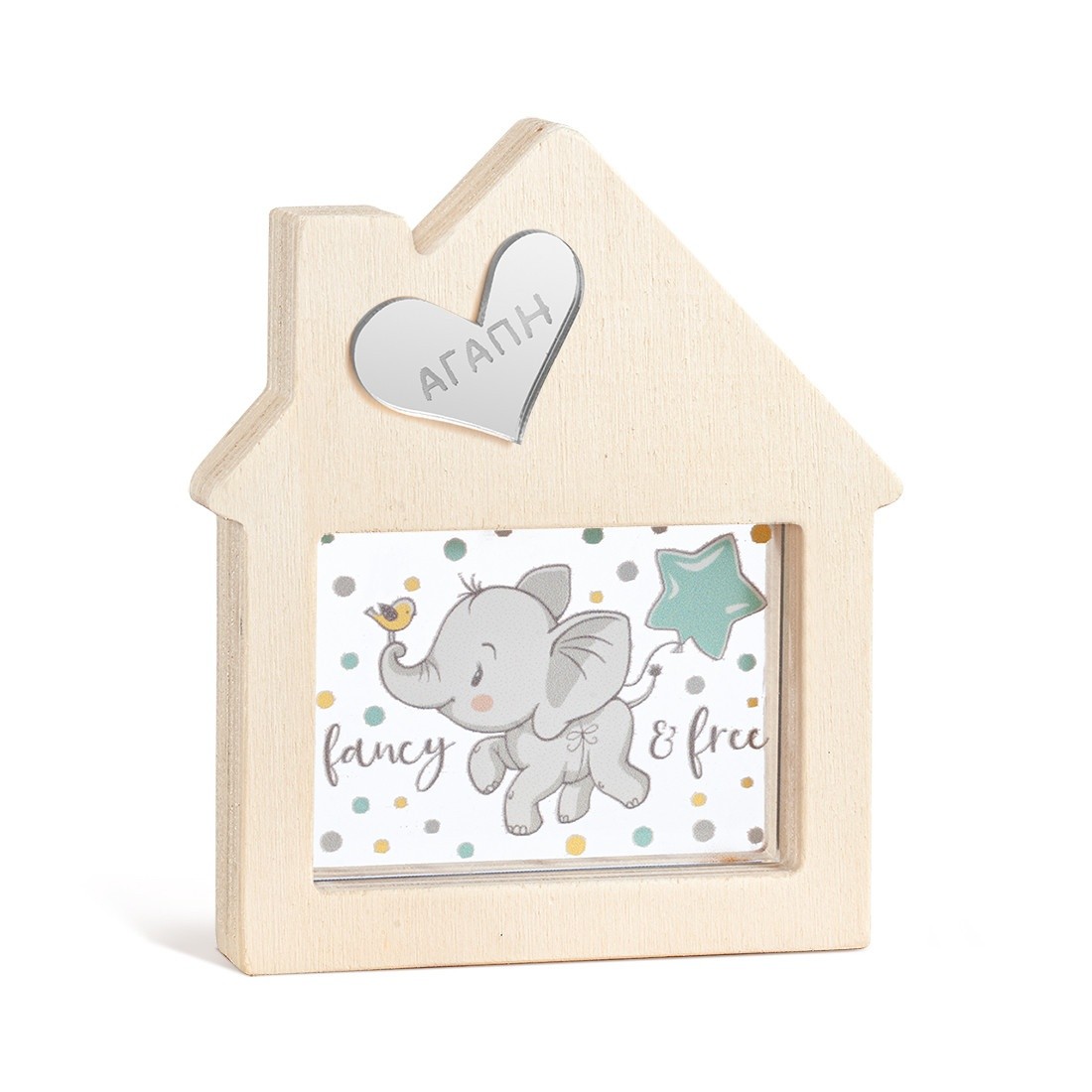 Ξύλινο διακοσμητικό σπιτάκι με καμινάδα και εσοχή σε παραλληλόγραμμο σχήμα. Στο κέντρο είναι διακοσμημένο με παραλληλόγραμμο print plexiglass σε διάφανο χρώμα. Η παράσταση απεικονίζει το ελεφαντάκι με το μπαλόνι να είναι fancy and free.