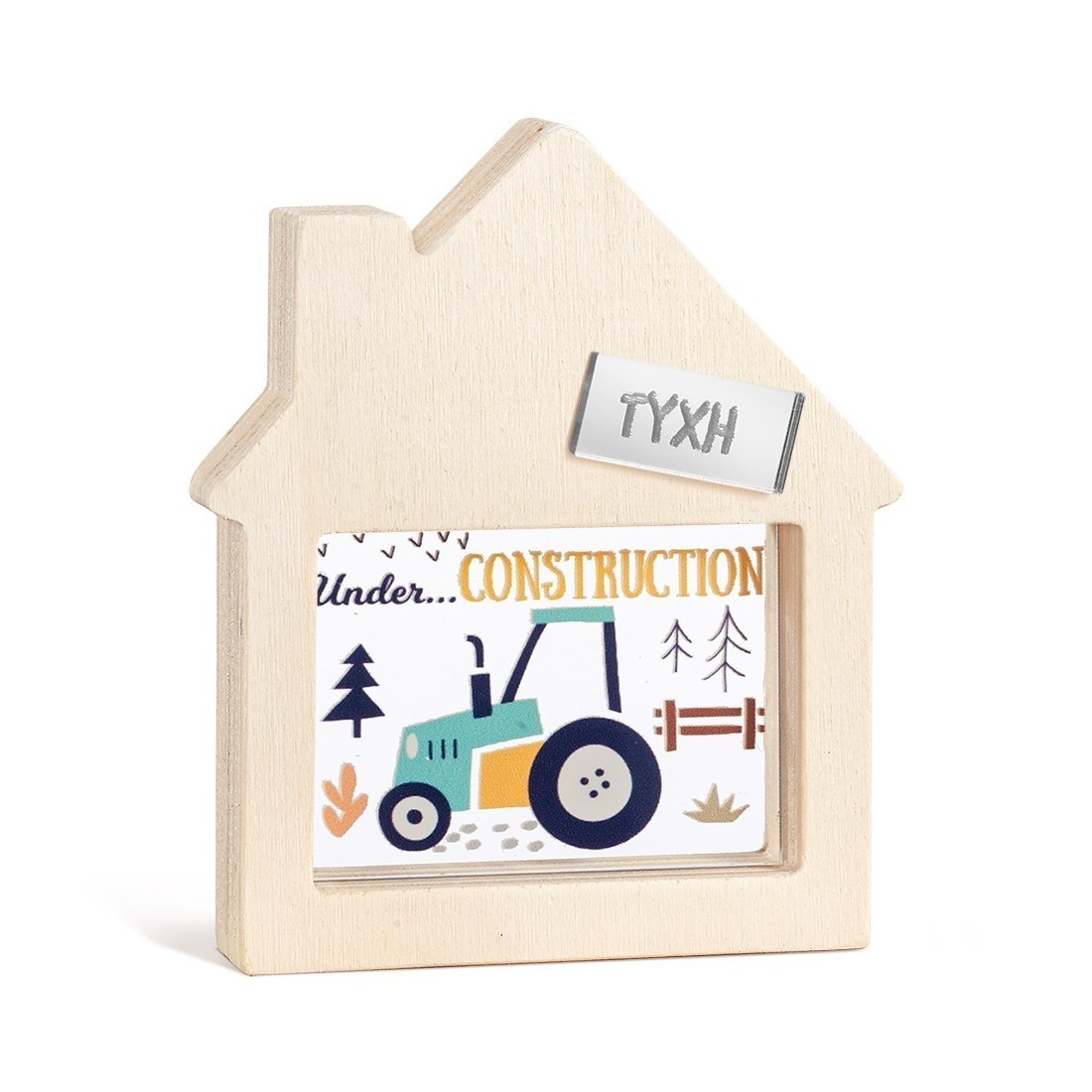 Ξύλινο διακοσμητικό σπιτάκι με καμινάδα και εσοχή σε παραλληλόγραμμο σχήμα. Στο κέντρο είναι διακοσμημένο με παραλληλόγραμμο print plexiglass σε διάφανο χρώμα. Η παράσταση απεικονίζει ένα τρακτερ με μότο "Under construction" .