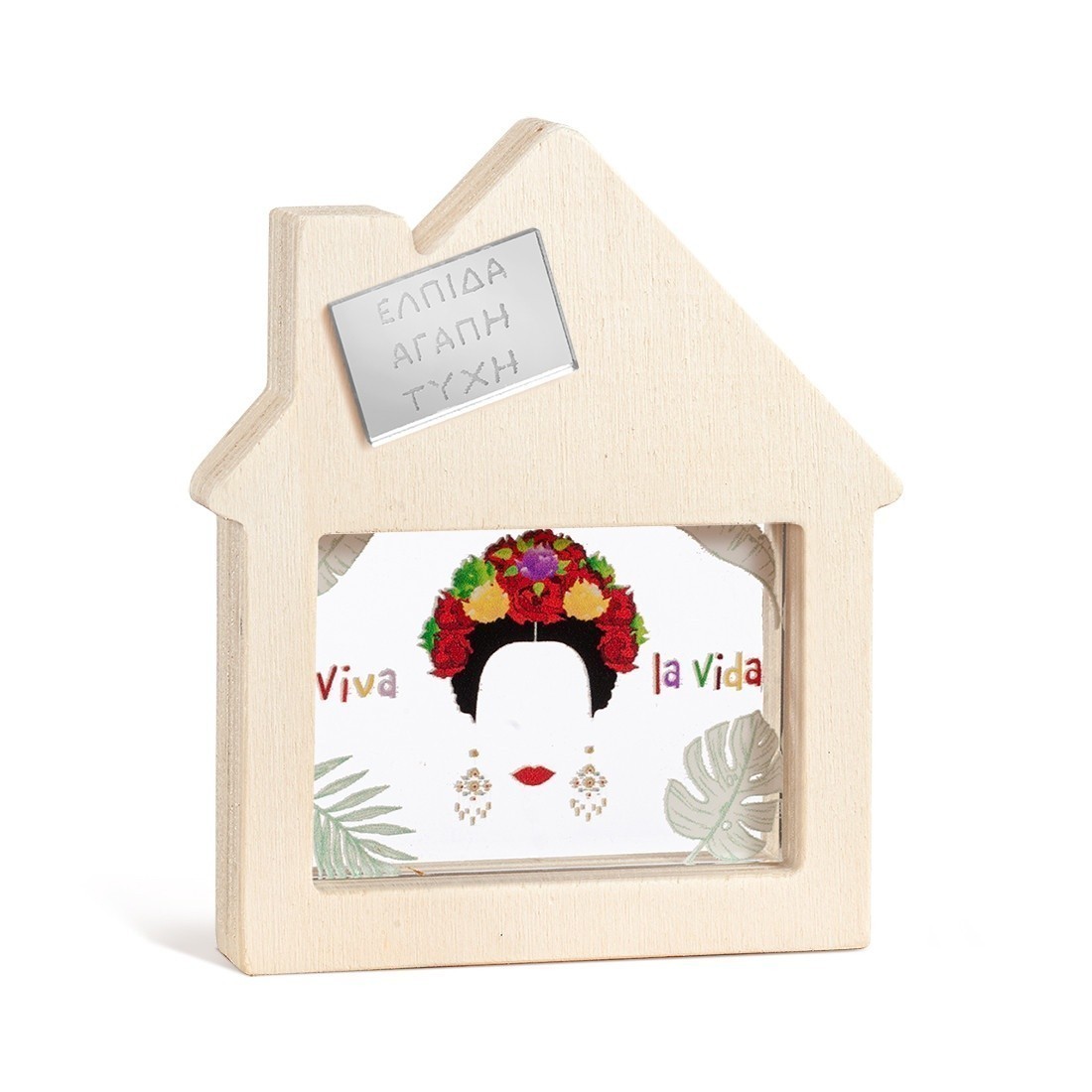 Ξύλινο διακοσμητικό σπιτάκι με καμινάδα και εσοχή σε παραλληλόγραμμο σχήμα. Στο κέντρο είναι διακοσμημένο με παραλληλόγραμμο print plexiglass σε διάφανο χρώμα. Η παράσταση απεικονίζει την Frida Kahlo.