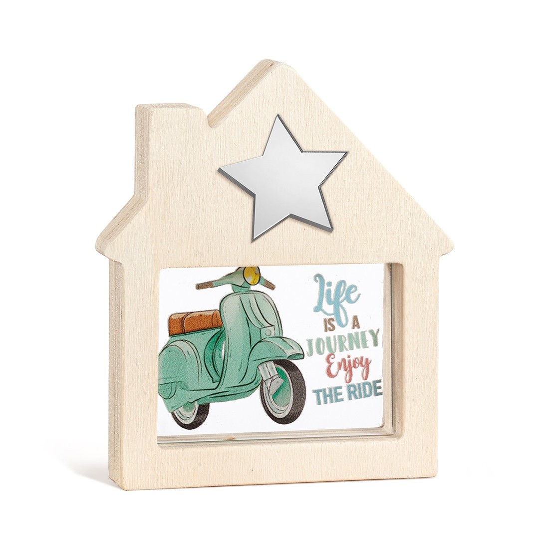 Ξύλινο διακοσμητικό σπιτάκι με καμινάδα και εσοχή σε παραλληλόγραμμο σχήμα. Στο κέντρο είναι διακοσμημένο με παραλληλόγραμμο print plexiglass σε διάφανο χρώμα. Η παράσταση απεικονίζει την βεραμάν βέσπα και μότο "Life is a journey enjoy the ride".
