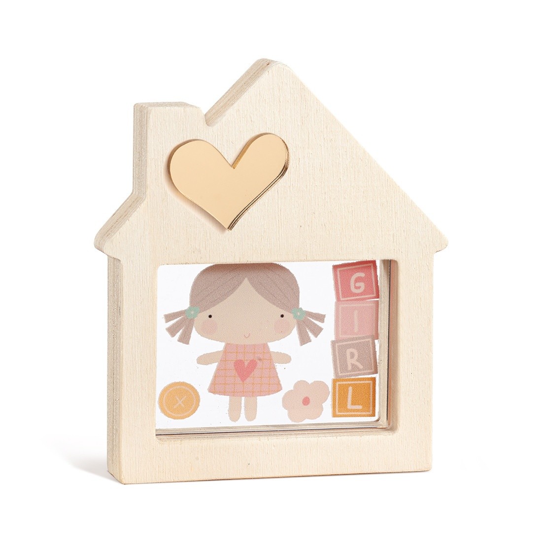 Ξύλινο διακοσμητικό σπιτάκι με καμινάδα και εσοχή σε παραλληλόγραμμο σχήμα. Στο κέντρο είναι διακοσμημένο με παραλληλόγραμμο print plexiglass σε διάφανο χρώμα. Η παράσταση απεικονίζει το κοριτσάκι σε ροζ girlish αποχρώσεις.