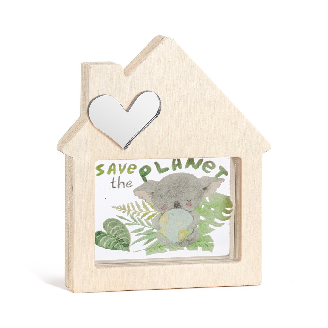 Ξύλινο διακοσμητικό σπιτάκι με καμινάδα και εσοχή σε παραλληλόγραμμο σχήμα. Στο κέντρο είναι διακοσμημένο με παραλληλόγραμμο print plexiglass σε διάφανο χρώμα. Η παράσταση απεικονίζει το κοάλα να κρατάει αγκαλιά την υδρόγειο και να στέλνει μήνυμα "save the planet" .