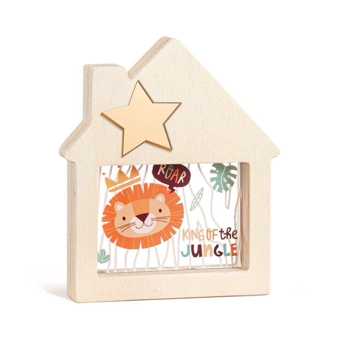 Ξύλινο διακοσμητικό σπιτάκι με καμινάδα και εσοχή σε παραλληλόγραμμο σχήμα. Στο κέντρο είναι διακοσμημένο με παραλληλόγραμμο print plexiglass σε διάφανο χρώμα. Η παράσταση απεικονίζει το λιονταράκι ως "king of the jungle".
