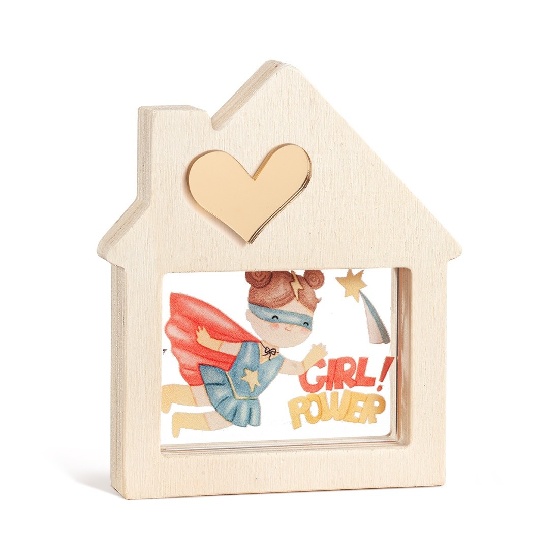 Ξύλινο διακοσμητικό σπιτάκι με καμινάδα και εσοχή σε παραλληλόγραμμο σχήμα. Στο κέντρο είναι διακοσμημένο με παραλληλόγραμμο print plexiglass σε διάφανο χρώμα. Η παράσταση απεικονίζει την super girl power.