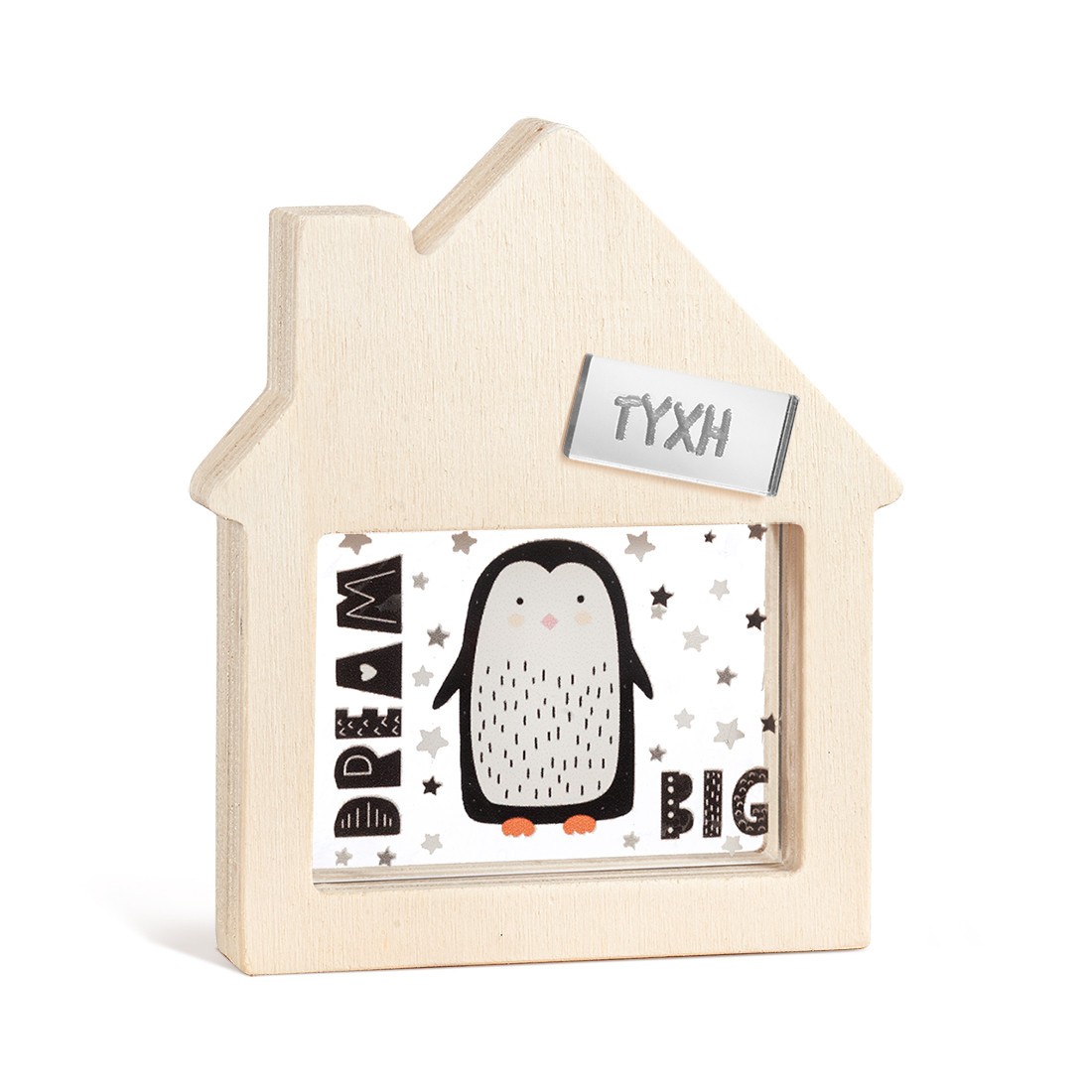 Ξύλινο διακοσμητικό σπιτάκι με καμινάδα και εσοχή σε παραλληλόγραμμο σχήμα. Στο κέντρο είναι διακοσμημένο με παραλληλόγραμμο print plexiglass σε διάφανο χρώμα. Η παράσταση απεικονίζει πινγκουϊνο και μότο "dream big" .