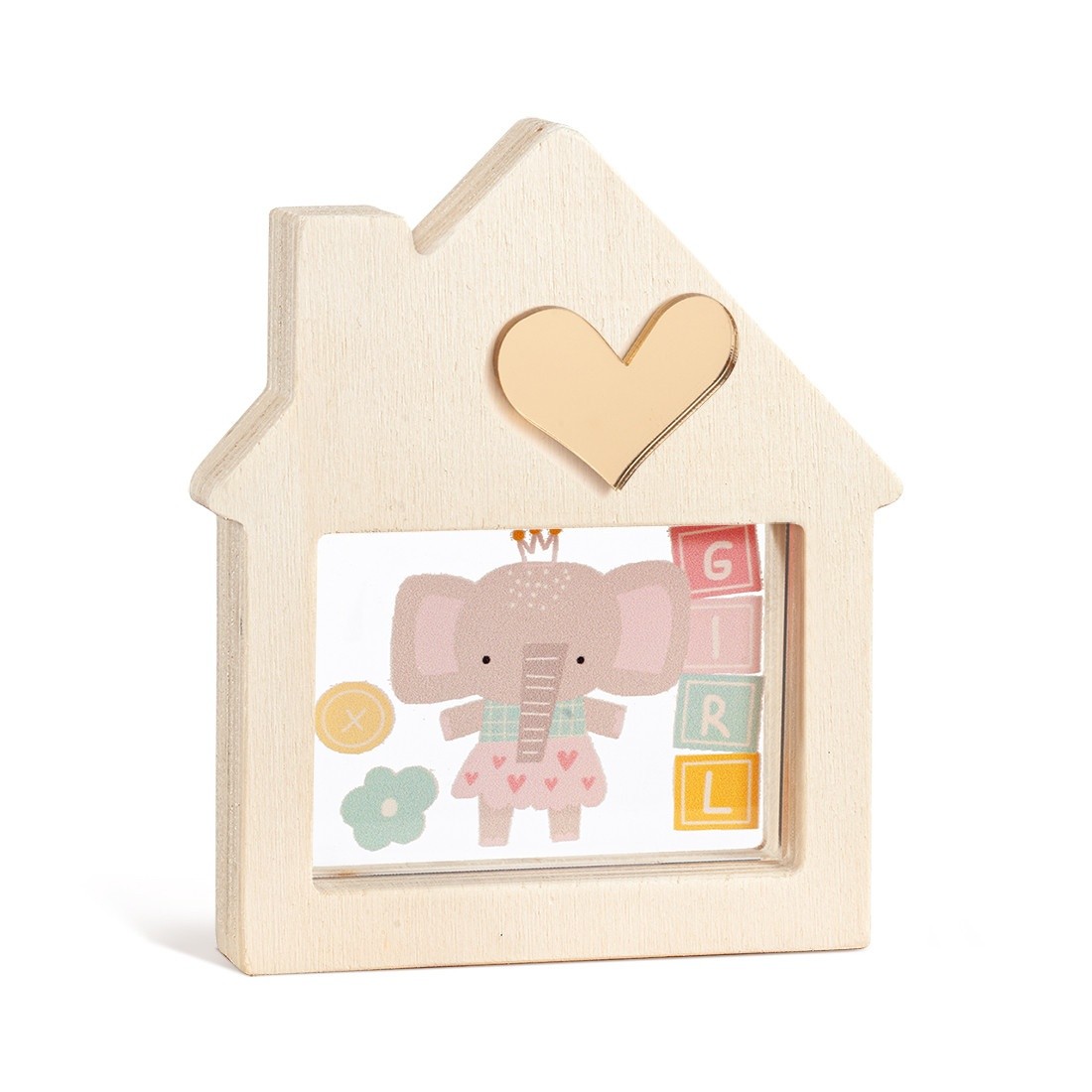 Ξύλινο διακοσμητικό σπιτάκι με καμινάδα και εσοχή σε παραλληλόγραμμο σχήμα. Στο κέντρο είναι διακοσμημένο με παραλληλόγραμμο print plexiglass σε διάφανο χρώμα. Η παράσταση απεικονίζει ελεφαντάκι σε ροζ αποχρώσεις.