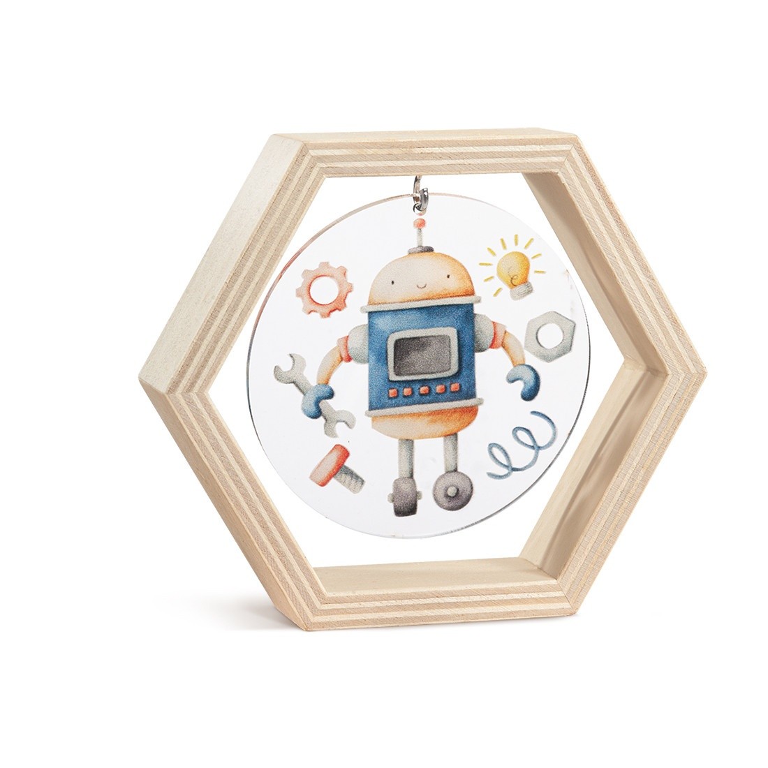 Ξύλινο διακοσμητικό σε σχήμα πολύγωνο.Το καδράκι είναι διακοσμημένο με στρογγυλή print plexiglass παράσταση σε διάφανο χρώμα.Η παράσταση απεικονίζει το ρομπότ με φόντο διάφορα εργαλεία.