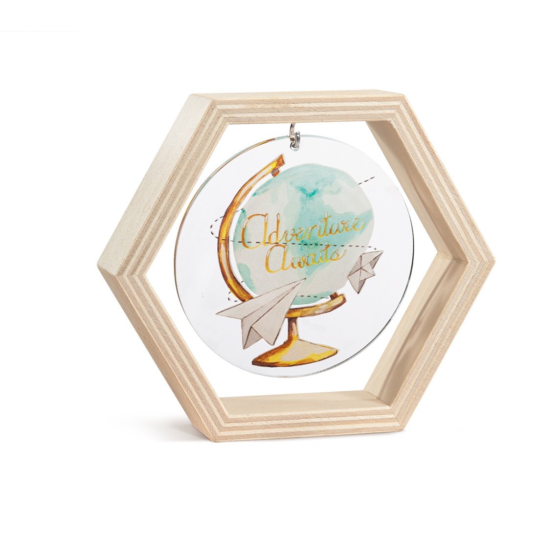 Ξύλινο διακοσμητικό σε σχήμα πολύγωνο.Το καδράκι είναι διακοσμημένο με στρογγυλή print plexiglass παράσταση σε διάφανο χρώμα.Η παράσταση απεικονίζει την υδρόγειο και μότο "Αdventure awaits" .