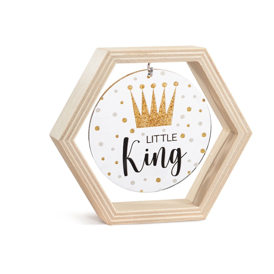 Ξύλινο διακοσμητικό σε σχήμα πολύγωνο.Το καδράκι είναι διακοσμημένο με στρογγυλή print plexiglass παράσταση σε διάφανο χρώμα.Η παράσταση απεικονίζει το στέμμα του Little king .