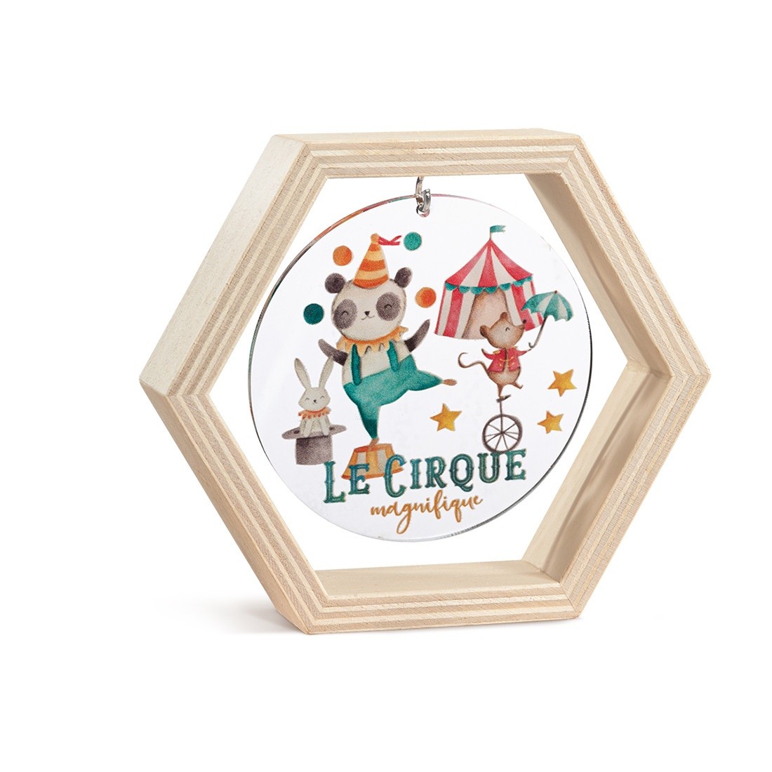 Ξύλινο διακοσμητικό σε σχήμα πολύγωνο.Το καδράκι είναι διακοσμημένο με στρογγυλή print plexiglass παράσταση σε διάφανο χρώμα.Η παράσταση απεικονίζει το panda ακροβάτη με φόντο την σκηνή του τσίρκου .
