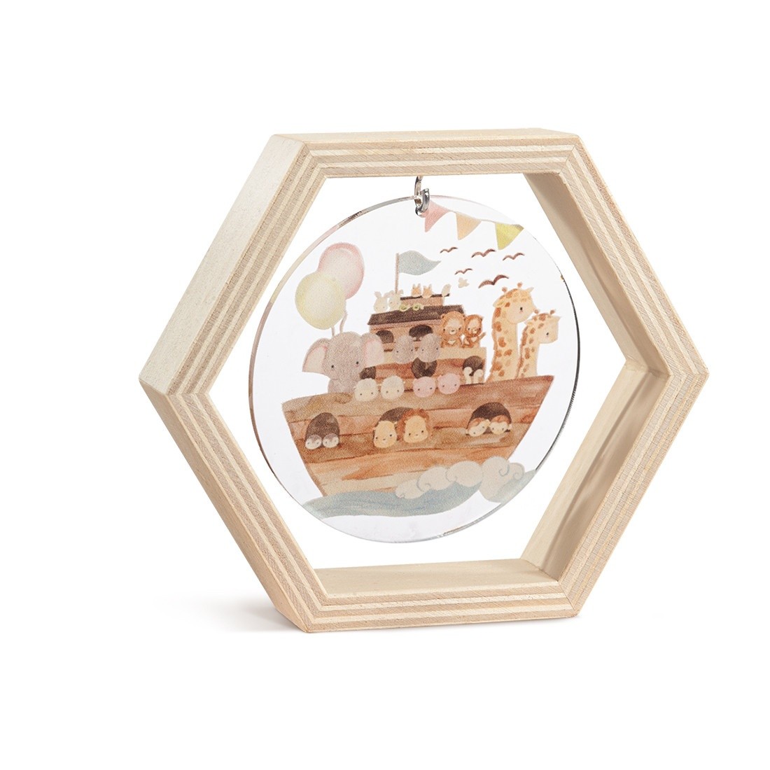 Ξύλινο διακοσμητικό σε σχήμα πολύγωνο.Το καδράκι είναι διακοσμημένο με στρογγυλή print plexiglass παράσταση σε διάφανο χρώμα.Η παράσταση απεικονίζει την κιβωτό με τα ζωάκια .