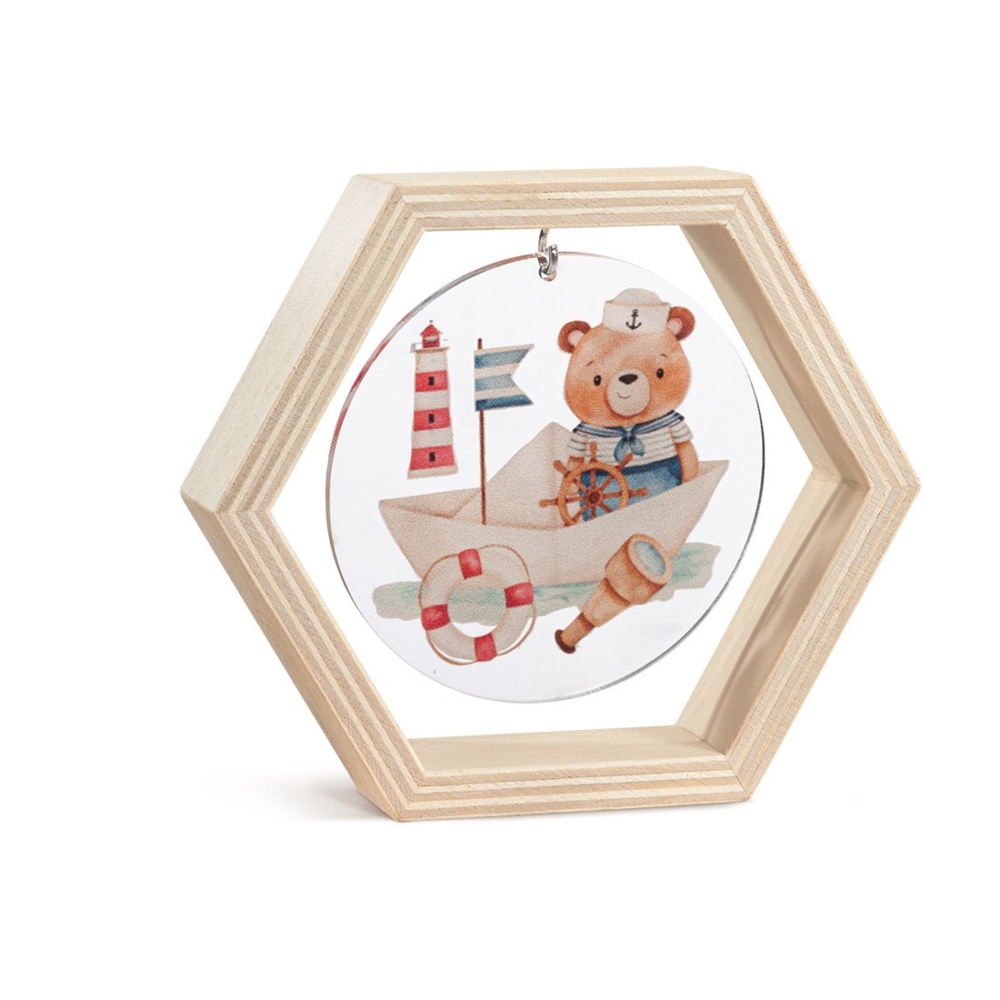 Ξύλινο διακοσμητικό σε σχήμα πολύγωνο.Το καδράκι είναι διακοσμημένο με στρογγυλή print plexiglass παράσταση σε διάφανο χρώμα.Η παράσταση απεικονίζει το αρκουδάκι ναυτάκι να αρμενίζει με την βαρκούλα του .