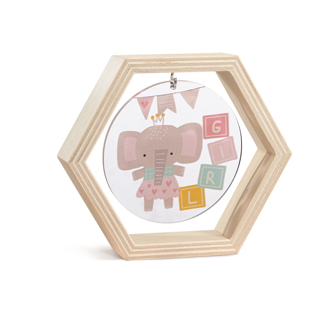 Ξύλινο διακοσμητικό σε σχήμα πολύγωνο.Το καδράκι είναι διακοσμημένο με στρογγυλή print plexiglass παράσταση σε διάφανο χρώμα.Η παράσταση απεικονίζει την ελεφαντίνα σε ροζ αποχρώσεις .