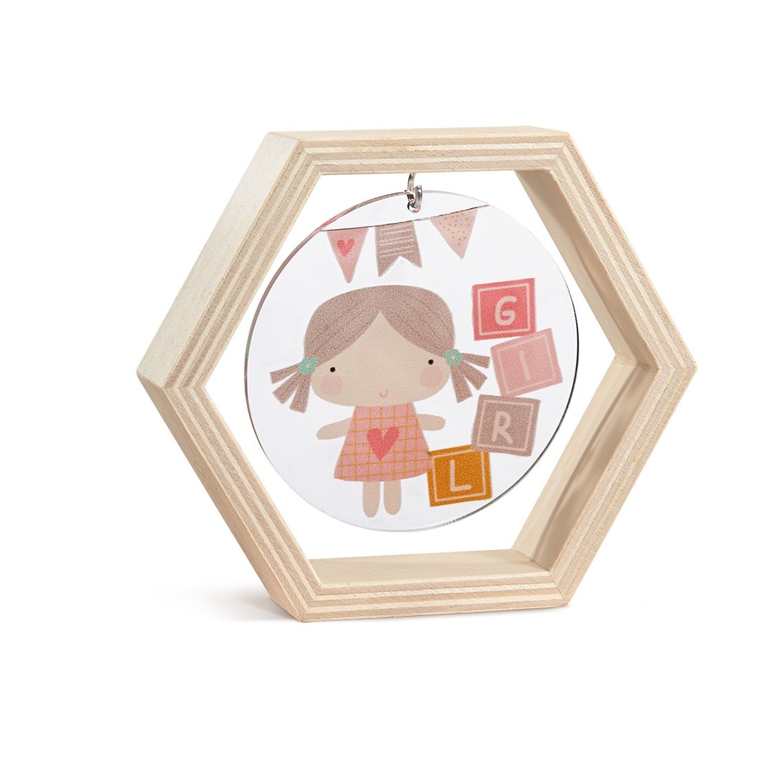 Ξύλινο διακοσμητικό σε σχήμα πολύγωνο.Το καδράκι είναι διακοσμημένο με στρογγυλή print plexiglass παράσταση σε διάφανο χρώμα.Η παράσταση απεικονίζει ένα κοριτσάκι σε ροζ girlish αποχρώσεις .