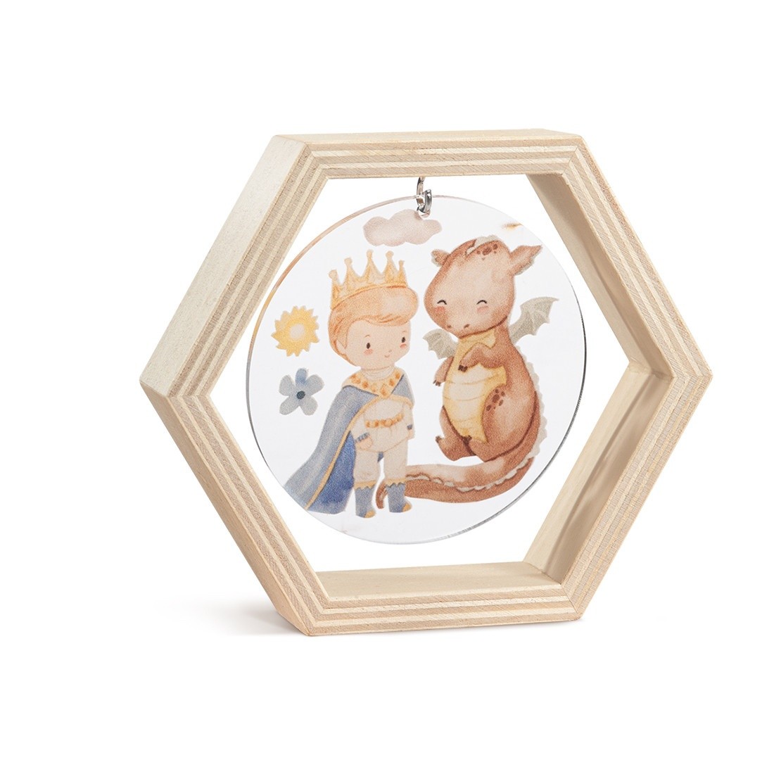 Ξύλινο διακοσμητικό σε σχήμα πολύγωνο.Το καδράκι είναι διακοσμημένο με στρογγυλή print plexiglass παράσταση σε διάφανο χρώμα.Η παράσταση απεικονίζει τον πρίγκιπα του παραμυθιού παρέα με τον δράκο .