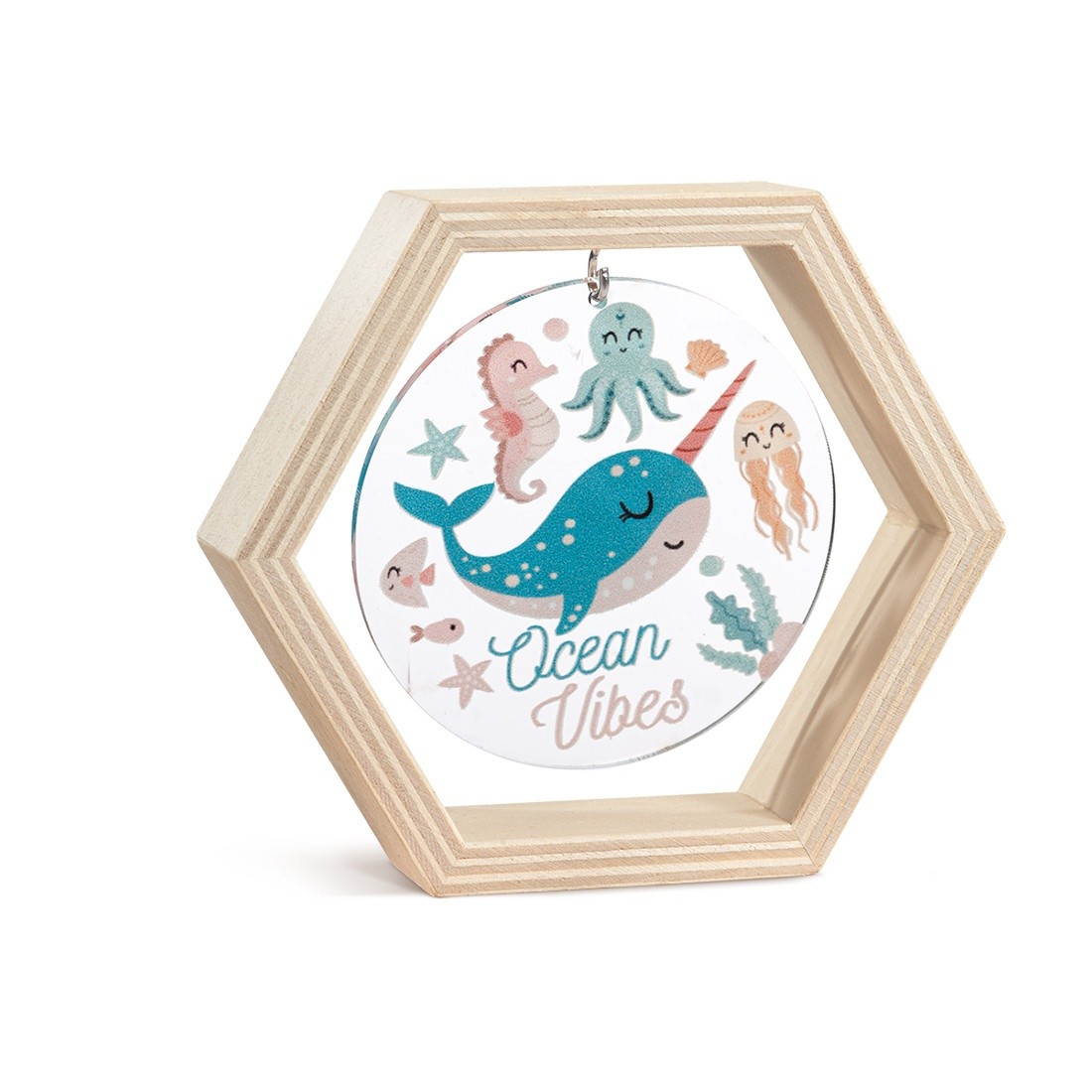 Ξύλινο διακοσμητικό σε σχήμα πολύγωνο.Το καδράκι είναι διακοσμημένο με στρογγυλή print plexiglass παράσταση σε διάφανο χρώμα.Η παράσταση απεικονίζει τον βυθό με την φάλαινα,τον ιππόκαμπο,την μέδουσα και το χταπόδι σε Ocean vibes .