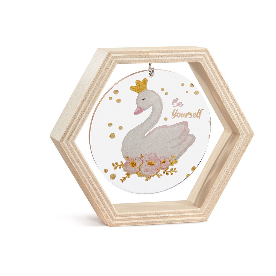 Ξύλινο διακοσμητικό σε σχήμα πολύγωνο.Το καδράκι είναι διακοσμημένο με στρογγυλή print plexiglass παράσταση σε διάφανο χρώμα.Η παράσταση απεικονίζει έναν κύκνο .