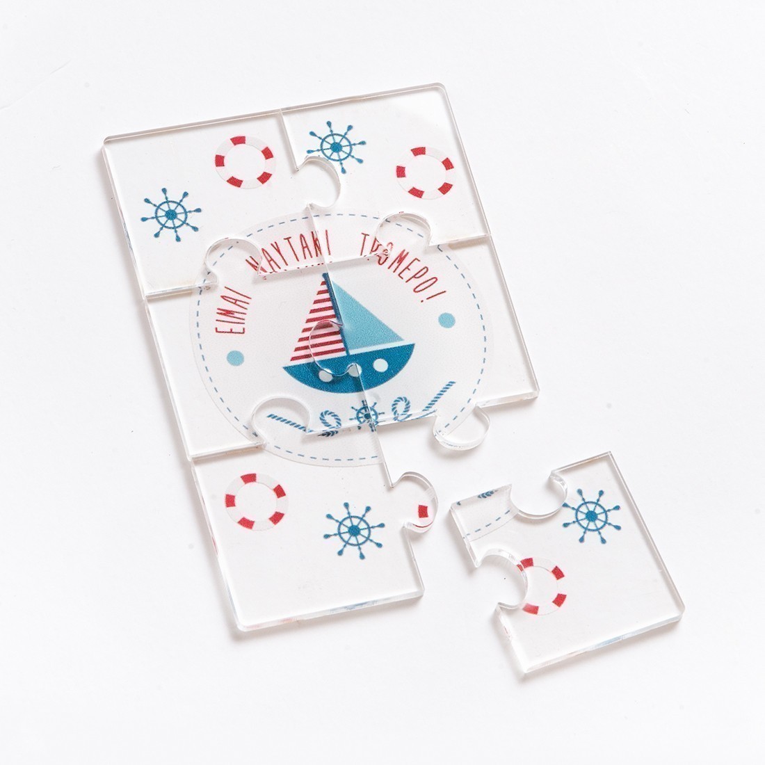 Puzzle 6 τεμαχίων με print παράσταση σε plexiglass διάφανο.Η παράσταση απεικονίζει το κλασσικό ναυτικό θέμα με το καραβάκι και moto "είμαι ναυτάκι τρομερό" .Στην τιμή περιλαμβάνεται το κουτάκι δώρου που είναι τοποθετημένο το puzzle.