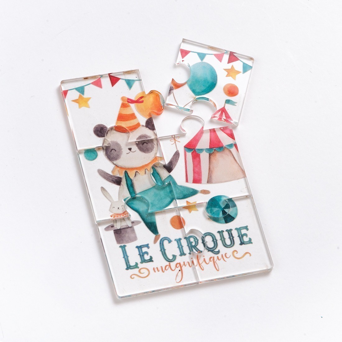 Puzzle 6 τεμαχίων με print παράσταση σε plexiglass διάφανο.Η παράσταση απεικονίζει το panda να κάνει ακροβατικά με φόντο τη σκηνή του τσίρκου.Στην τιμή περιλαμβάνεται το κουτάκι δώρου που είναι τοποθετημένο το puzzle.