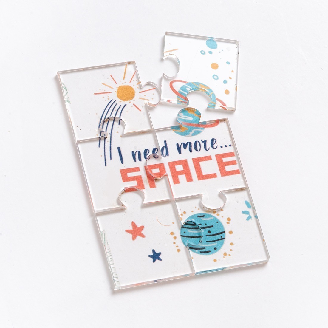 Puzzle 6 τεμαχίων με print παράσταση σε plexiglass διάφανο.Η παράσταση απεικονίζει το διάστημα και moto "I need more…SPACE".Στην τιμή περιλαμβάνεται το κουτάκι δώρου που είναι τοποθετημένο το puzzle.