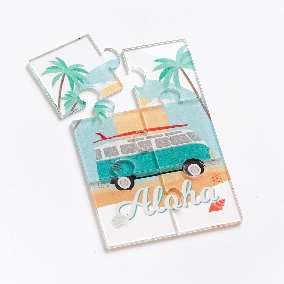 Puzzle 6 τεμαχίων με print παράσταση σε plexiglass διάφανο.Η παράσταση απεικονίζει ένα βεραμάν van ALOHA.Στην τιμή περιλαμβάνεται το κουτάκι δώρου που είναι τοποθετημένο το puzzle.