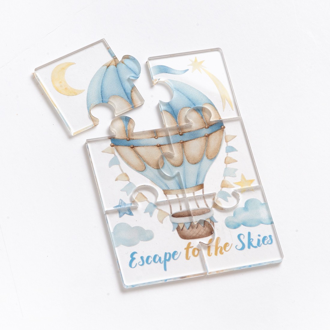 Puzzle 6 τεμαχίων με print παράσταση σε plexiglass διάφανο.Η παράσταση απεικονίζει το αερόστατο σε σιέλ αποχρώσεις δίνοντας το σύνθημα " Escape to the skies" .Στην τιμή περιλαμβάνεται το κουτάκι δώρου που είναι τοποθετημένο το puzzle.