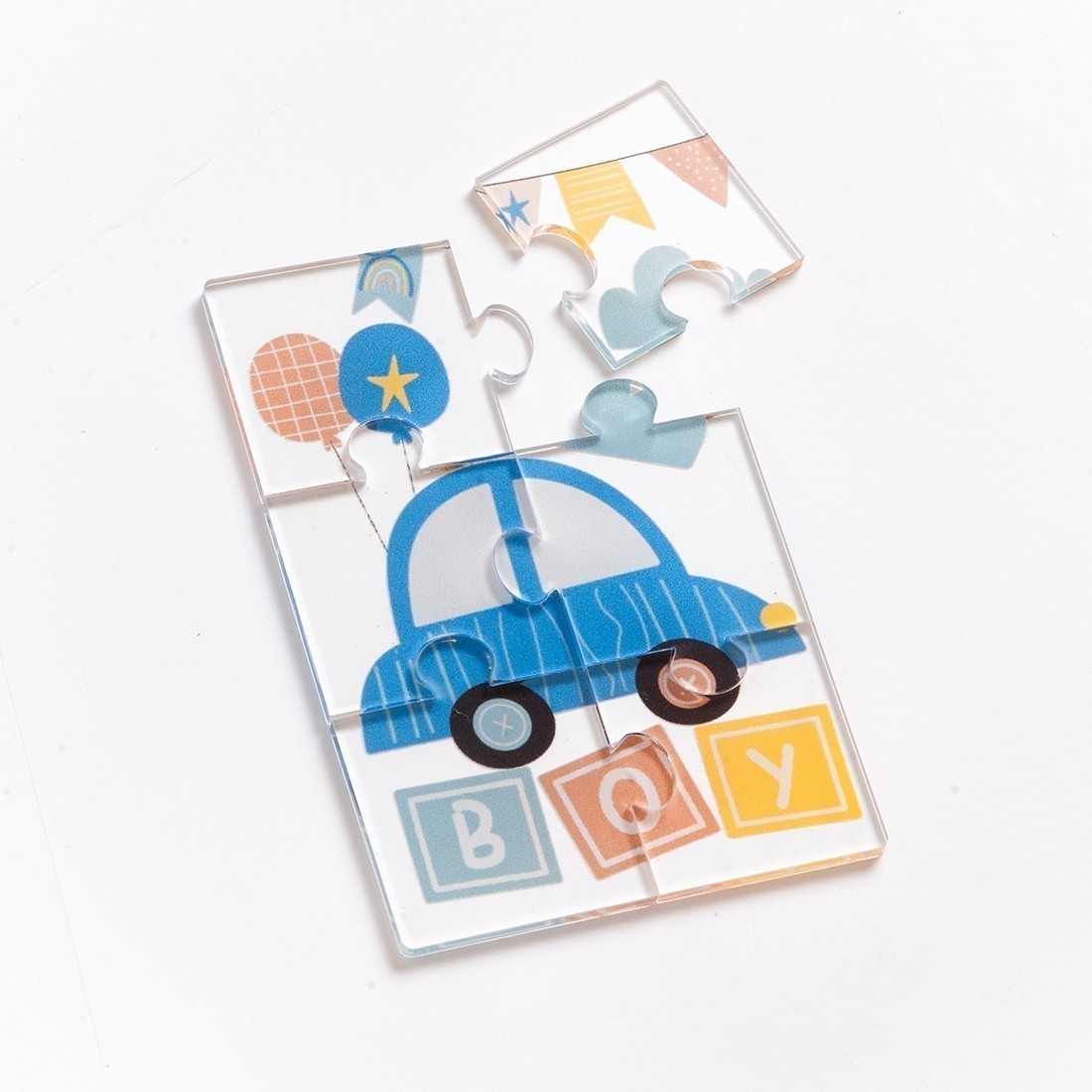 Puzzle 6 τεμαχίων με print παράσταση σε plexiglass διάφανο.Η παράσταση απεικονίζει ένα παιδικό αυτοκίνητάκι σε σιέλ αποχρώσεις.Στην τιμή περιλαμβάνεται το κουτάκι δώρου που είναι τοποθετημένο το puzzle.