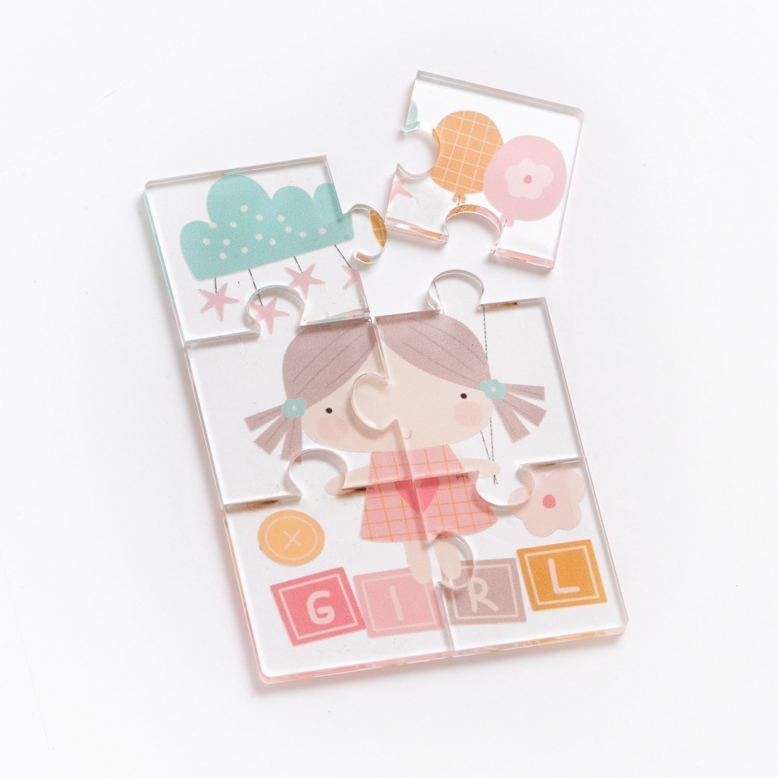 Puzzle 6 τεμαχίων με print παράσταση σε plexiglass διάφανο.Η παράσταση απεικονίζει ένα κοριτσάκι σε ροζ girlish αποχρώσεις .Στην τιμή περιλαμβάνεται το κουτάκι δώρου που είναι τοποθετημένο το puzzle.
