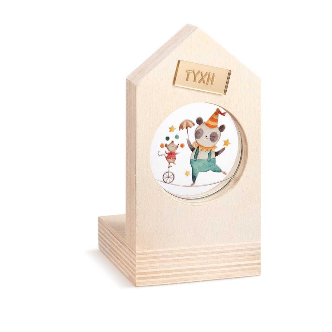 Ξύλινο διακοσμητικό σπιτάκι με ρεσώ.Το σπιτάκι είναι διακοσμημένο με στρογγυλό print plexiglass σε διάφανο χρώμα.Η παράσταση απεικονίζει το panda- ακροβάτης στο τσίρκο.