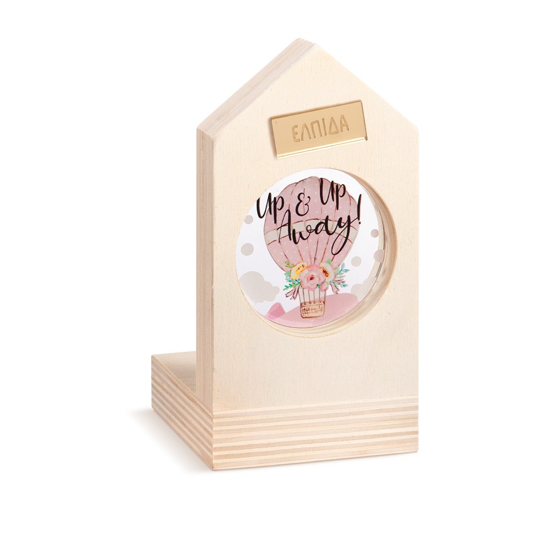 Ξύλινο διακοσμητικό σπιτάκι με ρεσώ.Το σπιτάκι είναι διακοσμημένο με στρογγυλό print plexiglass σε διάφανο χρώμα.Η παράσταση απεικονίζει το ροζ αερόστατο και μότο "Up,up and away".