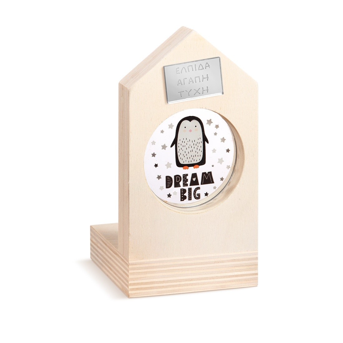 Ξύλινο διακοσμητικό σπιτάκι με ρεσώ.Το σπιτάκι είναι διακοσμημένο με στρογγυλό print plexiglass σε διάφανο χρώμα.Η παράσταση απεικονίζει πιγκουϊνο και μότο "Dream big"
