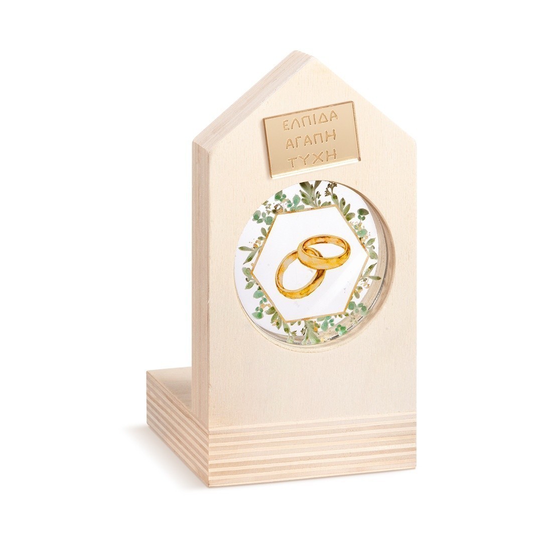 Ξύλινο διακοσμητικό σπιτάκι με ρεσώ.Το σπιτάκι είναι διακοσμημένο με στρογγυλό print plexiglass σε διάφανο χρώμα.Η παράσταση απεικονίζει βέρες σε στεφανάκι από πράσινο ευκάλυπτο.