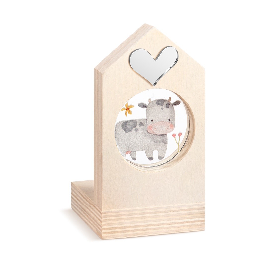 Ξύλινο διακοσμητικό σπιτάκι με ρεσώ.Το σπιτάκι είναι διακοσμημένο με στρογγυλό print plexiglass σε διάφανο χρώμα.Η παράσταση απεικονίζει μια αγελάδα στην φάρμα.