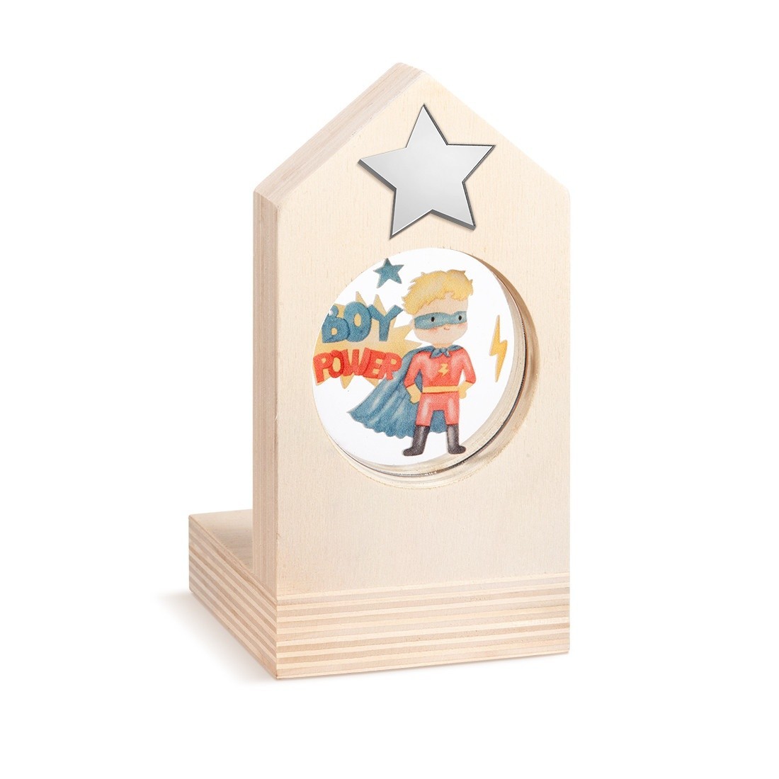 Ξύλινο διακοσμητικό σπιτάκι με ρεσώ.Το σπιτάκι είναι διακοσμημένο με στρογγυλό print plexiglass σε διάφανο χρώμα.Η παράσταση απεικονίζει τον superboy power.