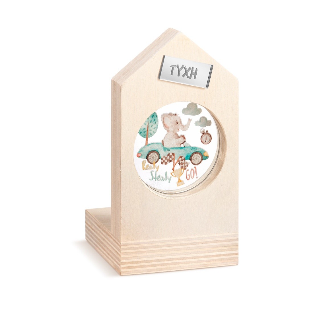 Ξύλινο διακοσμητικό σπιτάκι με ρεσώ.Το σπιτάκι είναι διακοσμημένο με στρογγυλό print plexiglass σε διάφανο χρώμα. Η παράσταση απεικονίζει το ελεφαντάκι να συμμετέχει σε αγώνες φόρμουλας και σύνθημα READY-STEADY-GO.