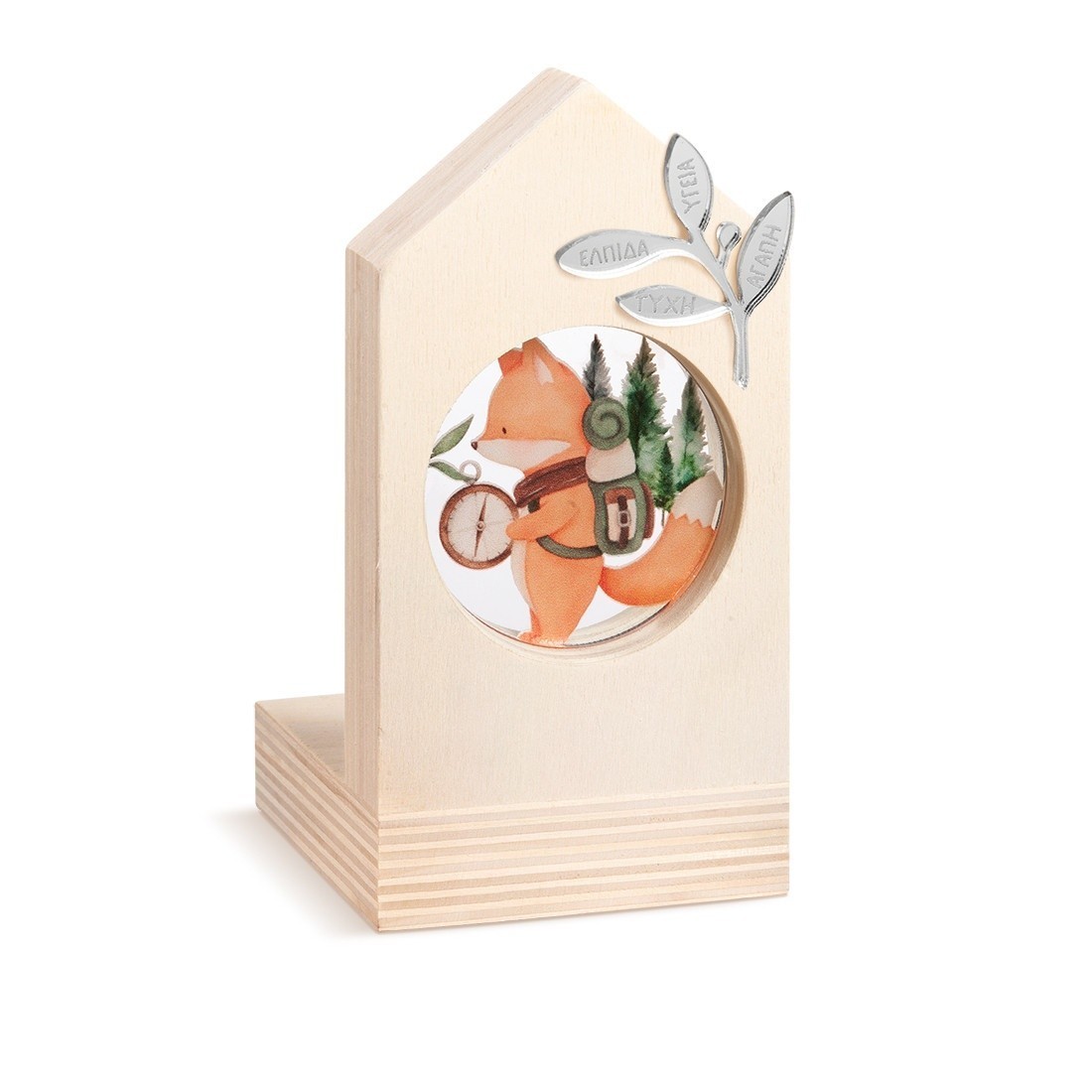 Ξύλινο διακοσμητικό σπιτάκι με ρεσώ.Το σπιτάκι είναι διακοσμημένο με στρογγυλό print plexiglass σε διάφανο χρώμα.Η παράσταση απεικονίζει την αλεπού να πηγαίνει camping.