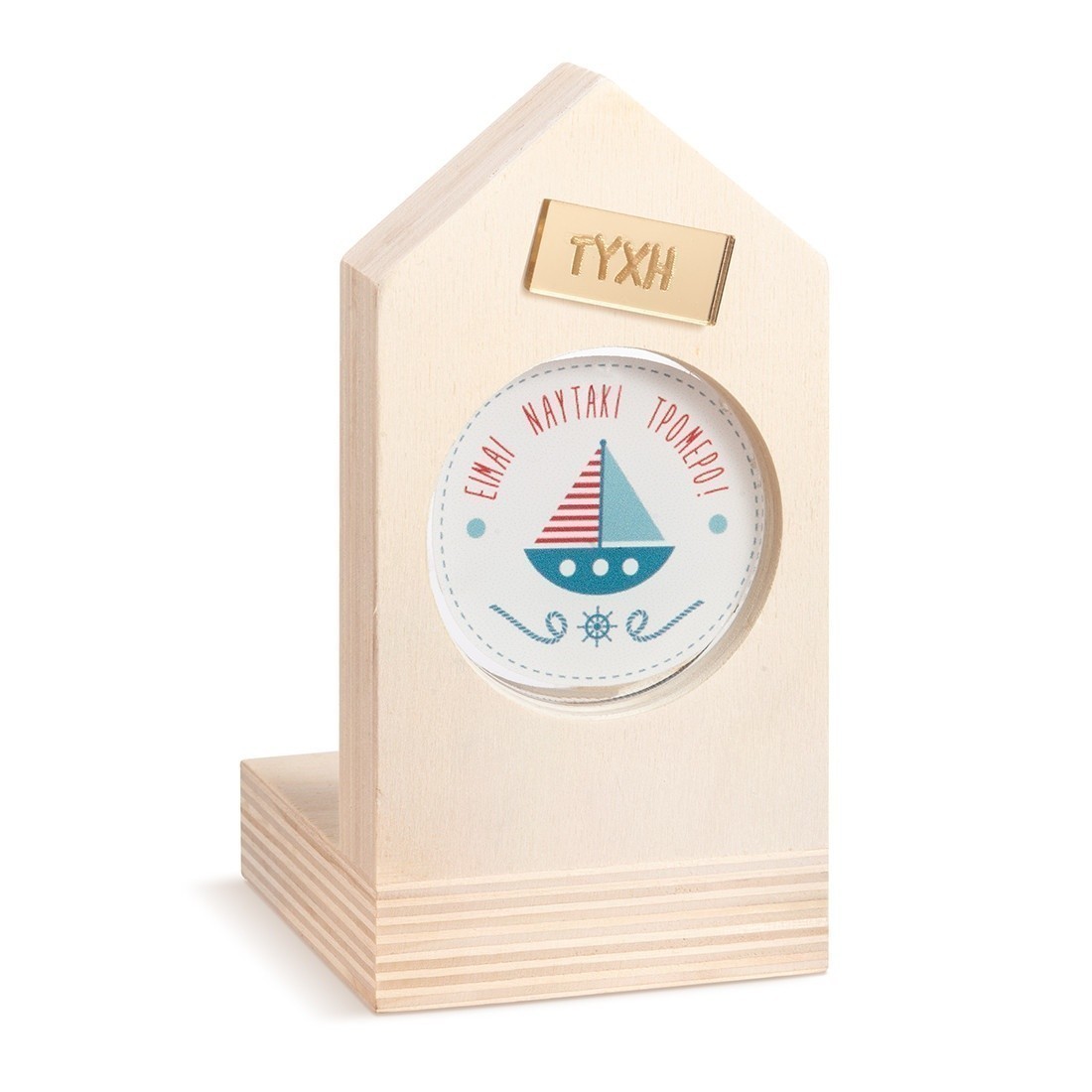 Ξύλινο διακοσμητικό σπιτάκι με ρεσώ.Το σπιτάκι είναι διακοσμημένο με στρογγυλό print plexiglass σε διάφανο χρώμα.Η παράσταση απεικονίζει το καραβωάκι και μότο "Είμαι ναυτάκι τρομερό".